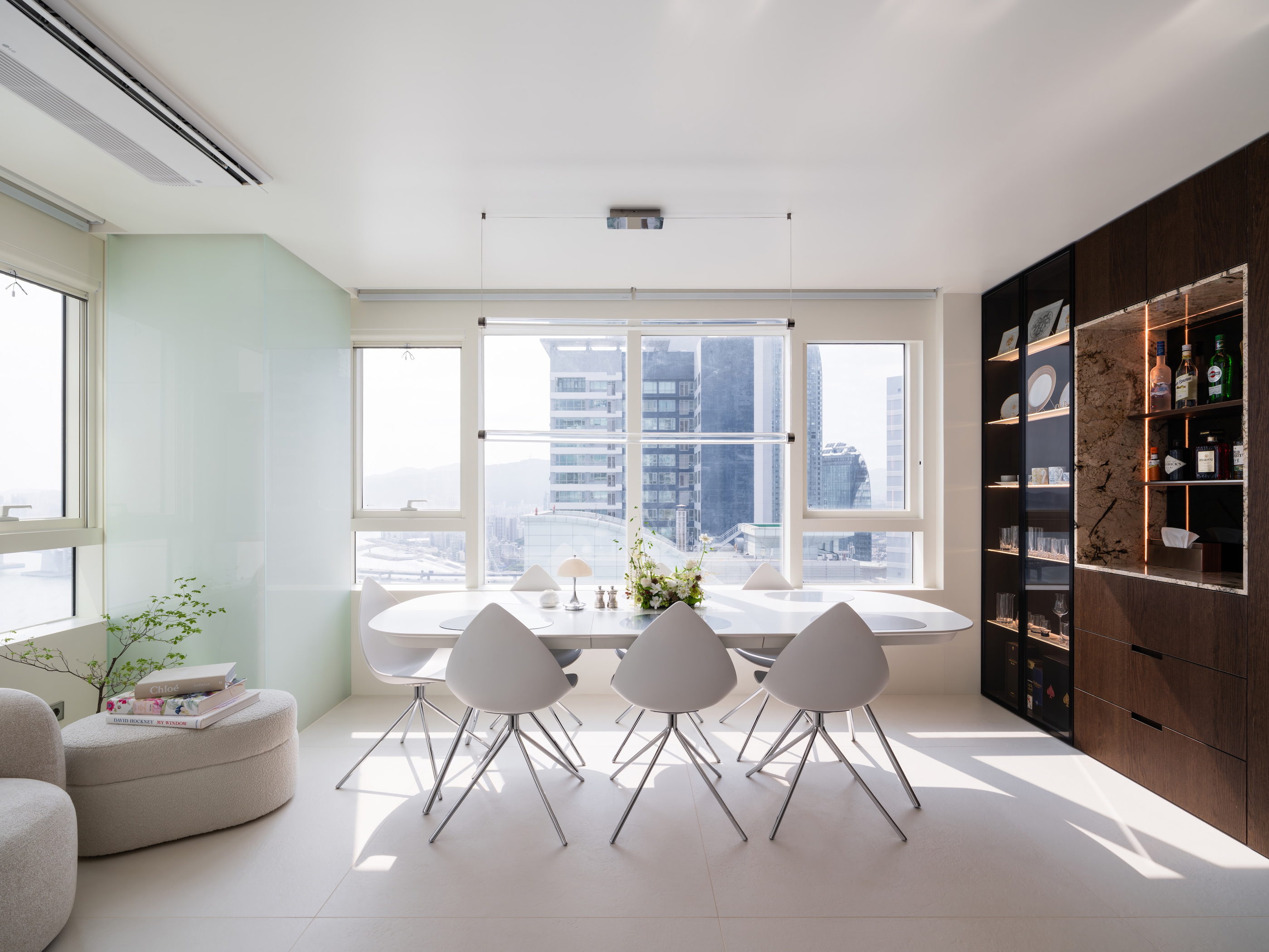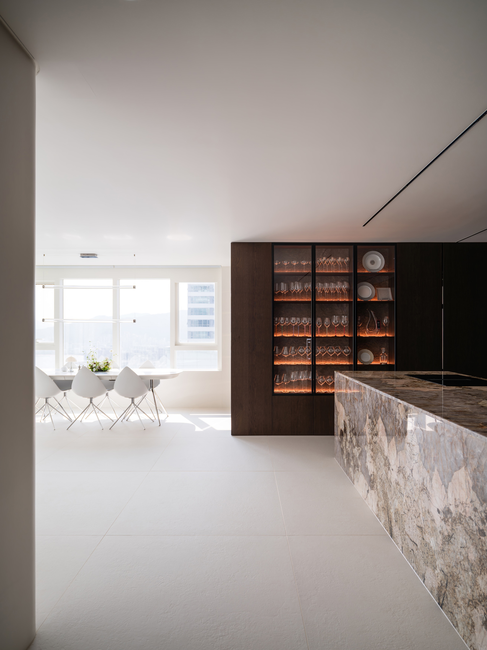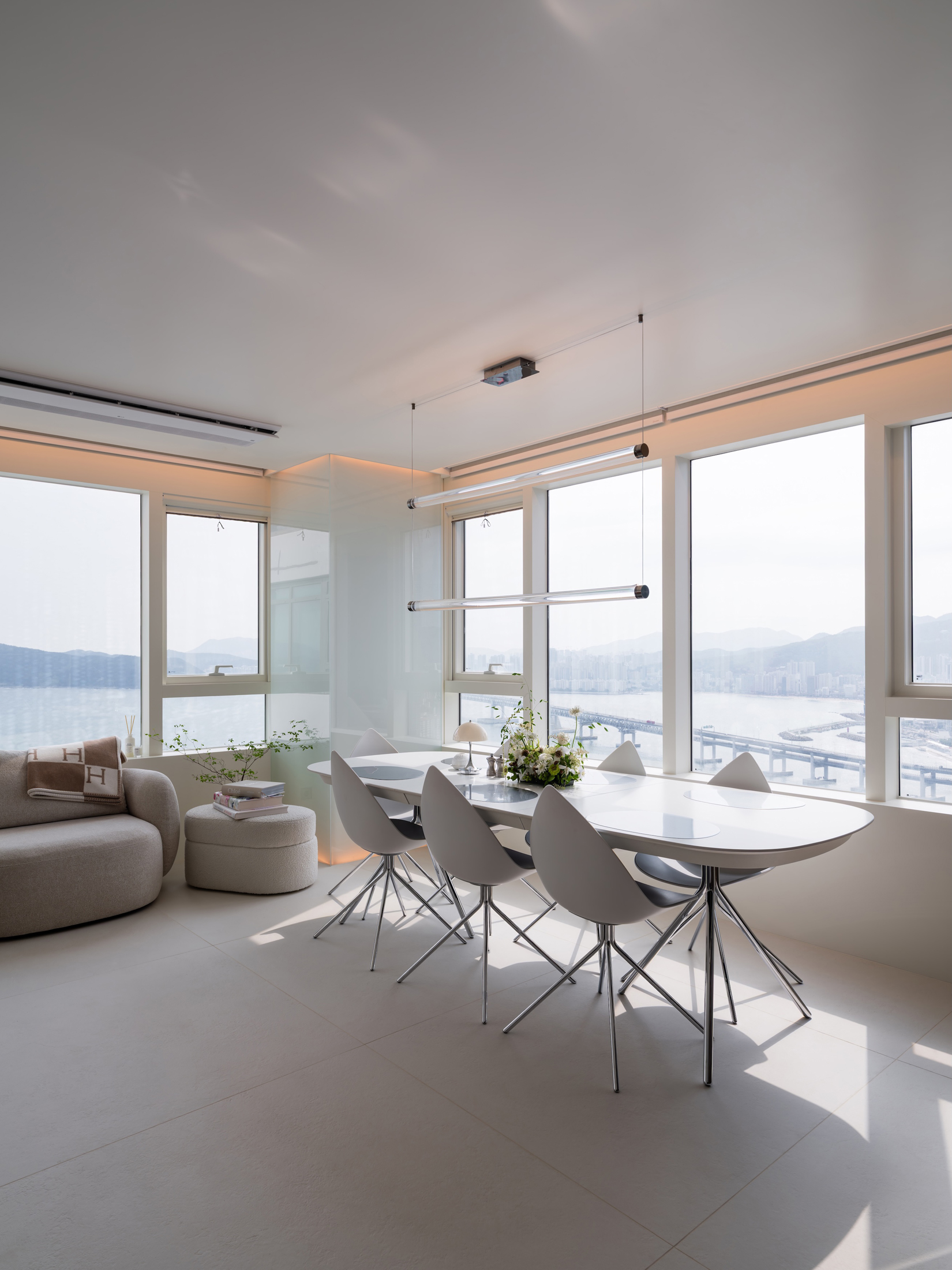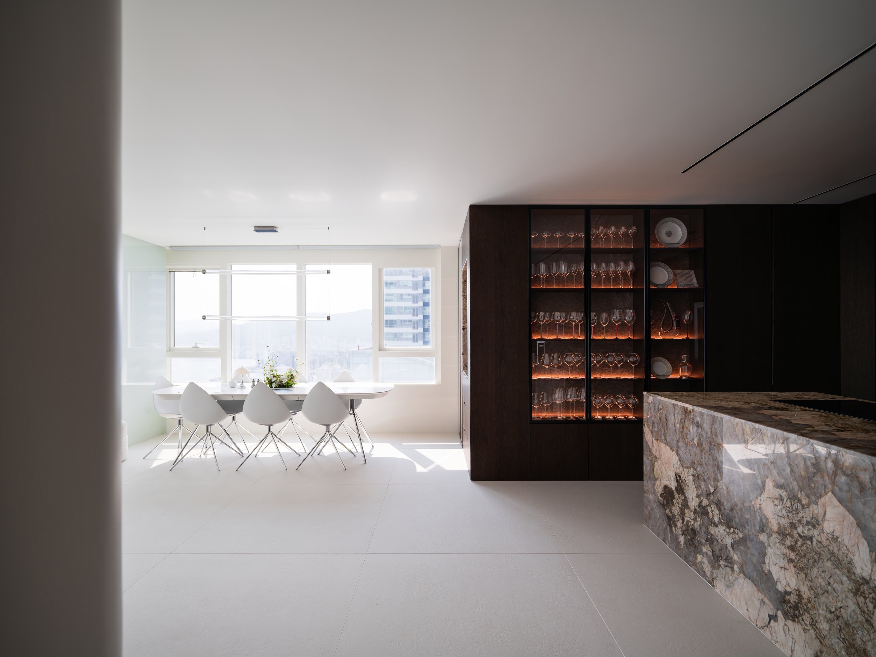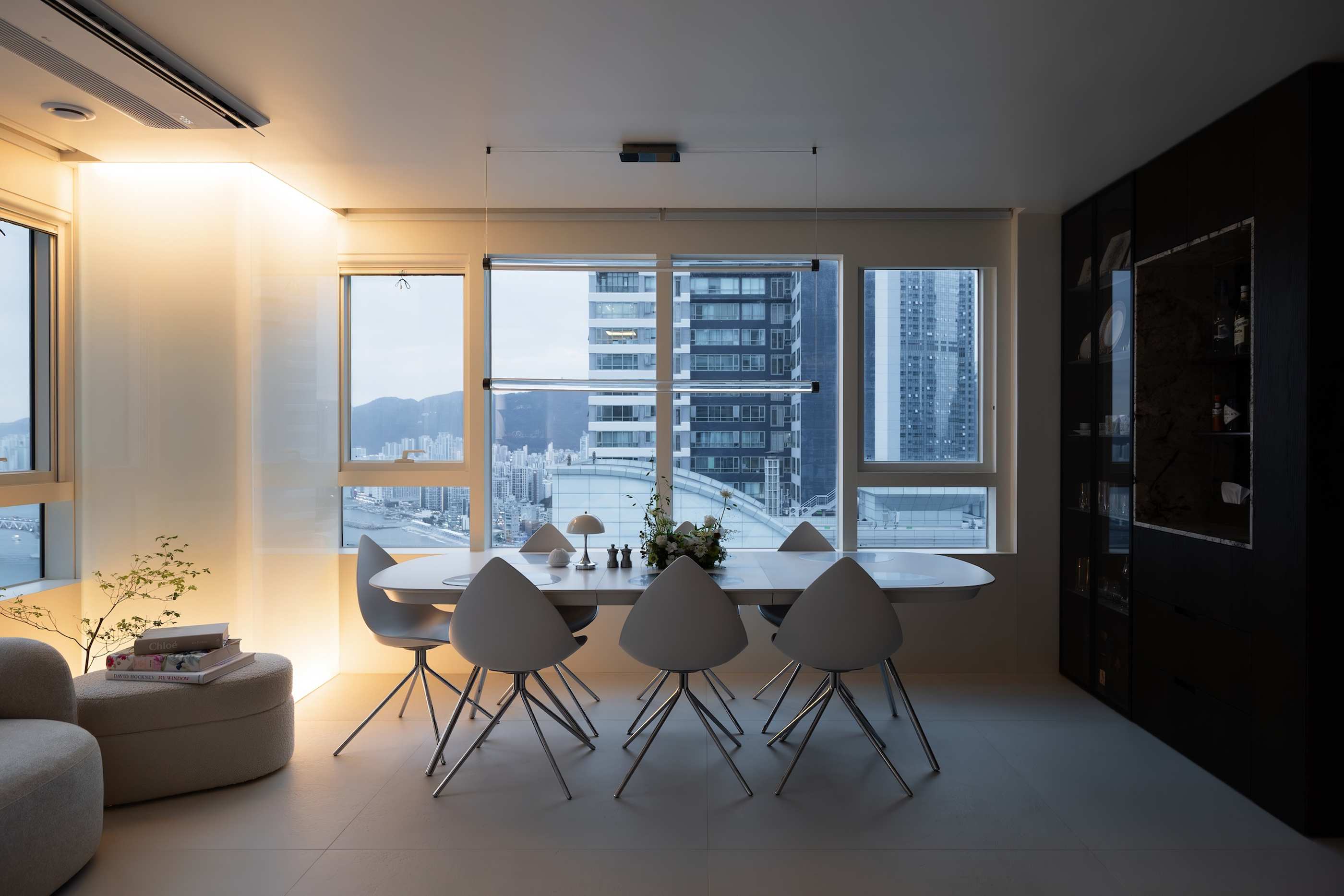 해운대 마린시티의 정점에 위치한 아델리스는 오피스텔 타입 주거 형태로 기존 평면을 개선해 필요한 공간을 극대화하는 레이아웃 작업에 매우 많은 노력을 기울인 공간이다. 불필요한 공간은 과감히 철거해서 필수적인 공간으로 편입시켜 공간을 확대했으며, 고객의 취향과 공간의 특성에 맞는 고급 마감재들로 미감이 충족되도록 설계하였다. 바다와 가장 가까운 곳에 위치한 아델리스의 아침은 윤슬에 반사된 자연광이 집안 내부를 충분히 밝히고 있다. 공간이 자연광을 충분히 머금을 수 있도록 고급도장마감으로 공간 전체를 계획했다. 사실 이번 공간의 특별함은 해가 진 이후부터 드러난다. 클라이언트와 충분히 고민해서 만들어낸 조명 위치와 개수, 그리고 조명하는 방식은 공간을 더욱 완결성 있게 만드는 핵심이었다.