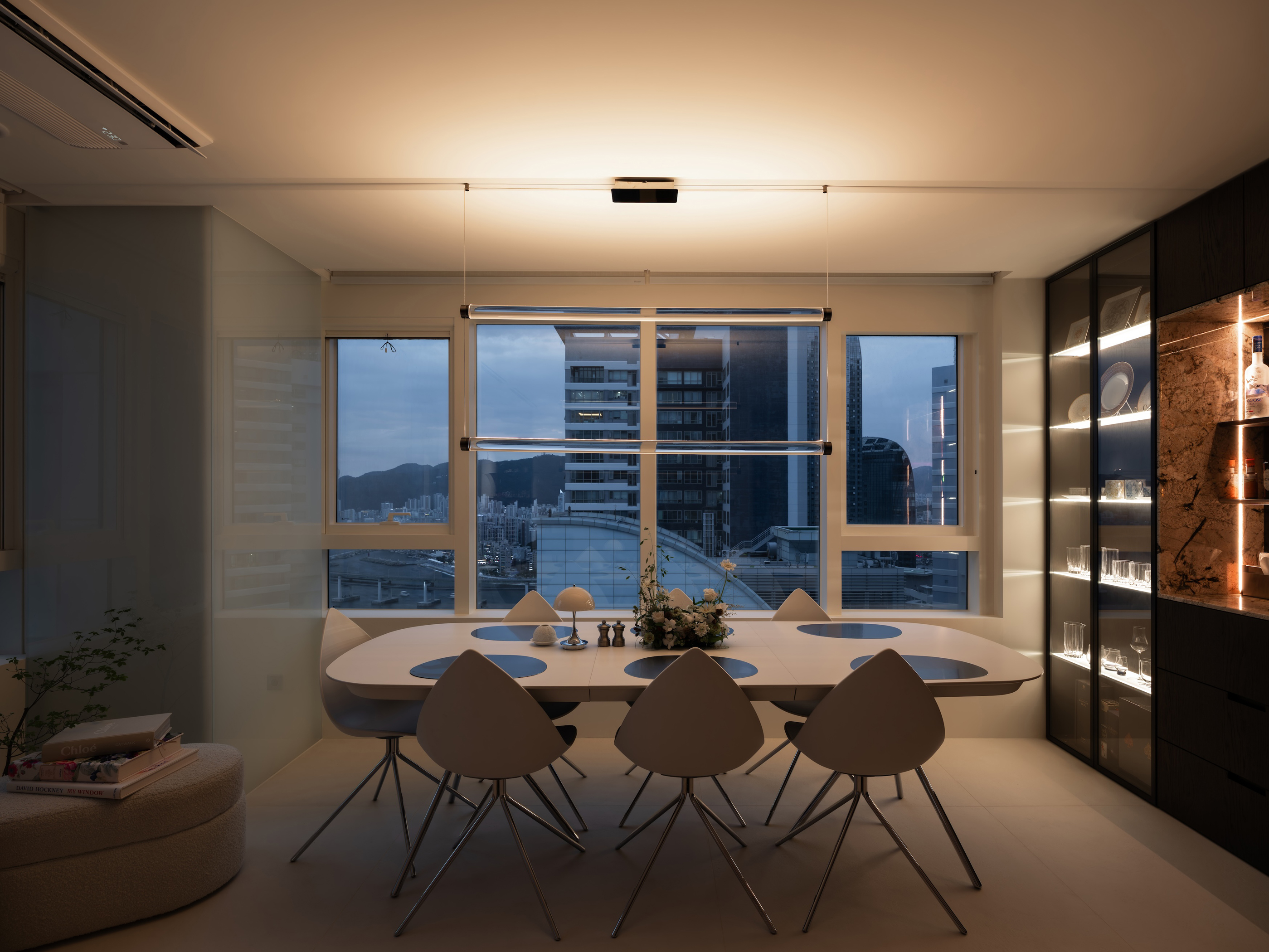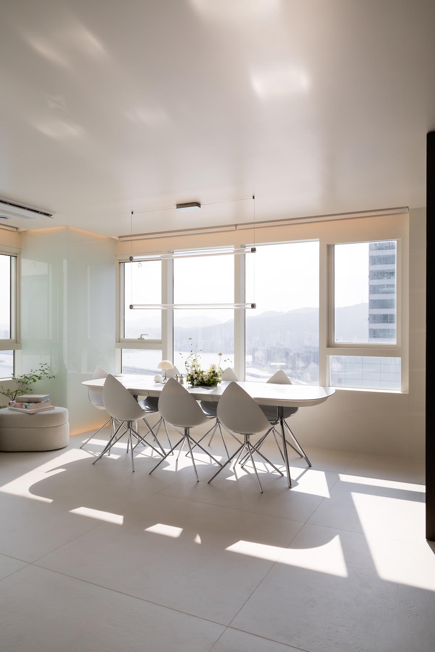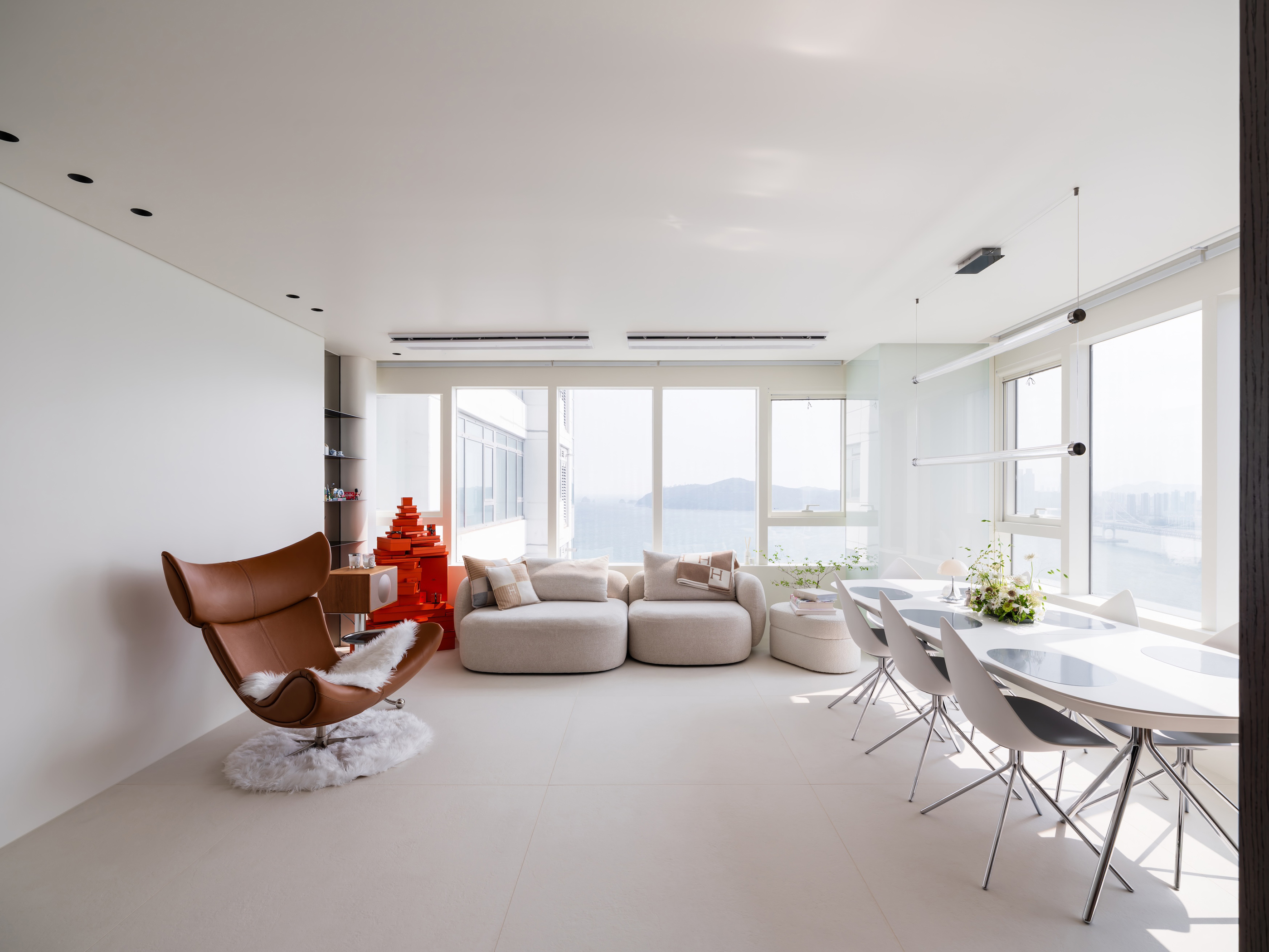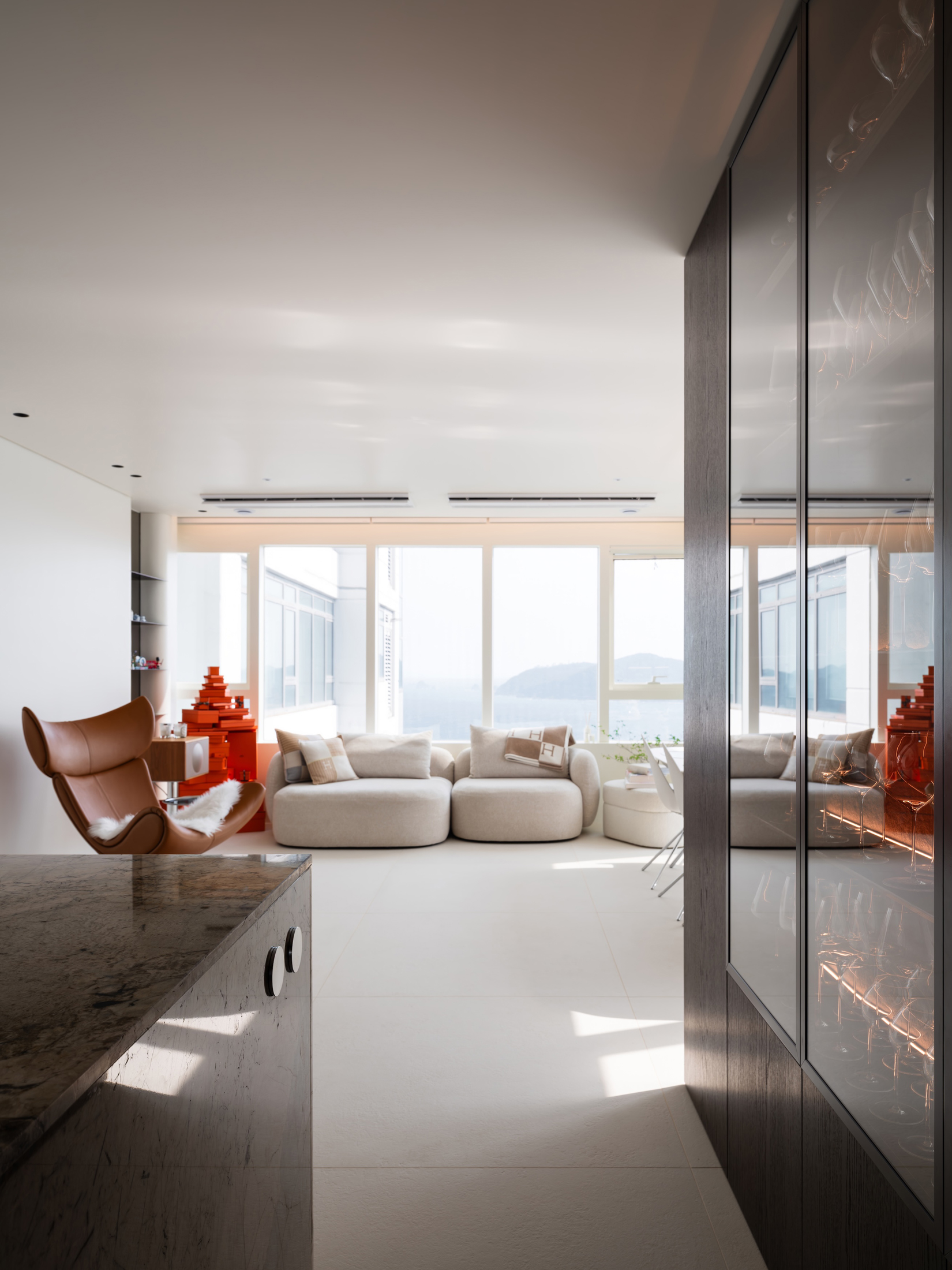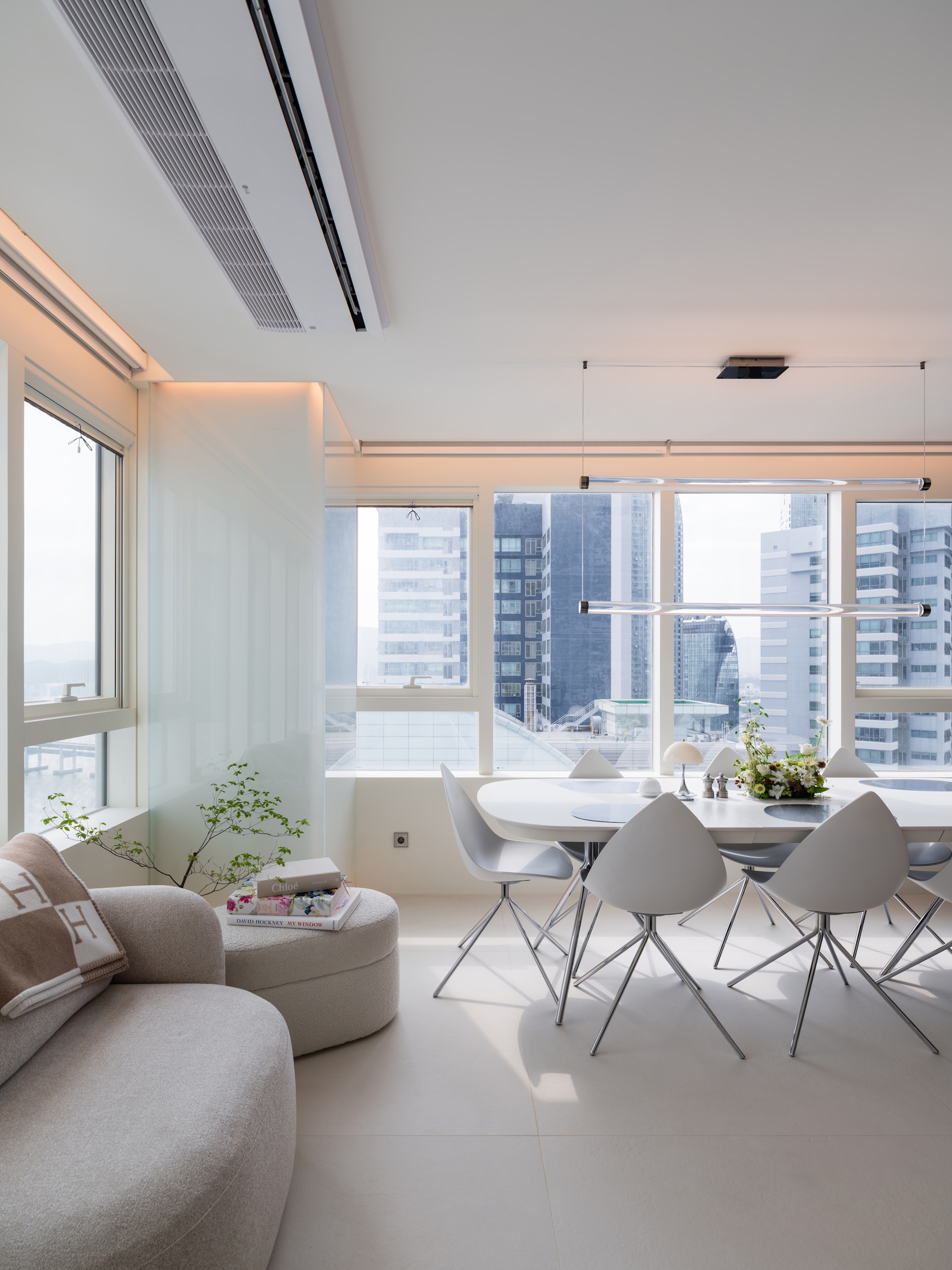 해운대 마린시티의 정점에 위치한 아델리스는 오피스텔 타입 주거 형태로 기존 평면을 개선해 필요한 공간을 극대화하는 레이아웃 작업에 매우 많은 노력을 기울인 공간이다. 불필요한 공간은 과감히 철거해서 필수적인 공간으로 편입시켜 공간을 확대했으며, 고객의 취향과 공간의 특성에 맞는 고급 마감재들로 미감이 충족되도록 설계하였다. 바다와 가장 가까운 곳에 위치한 아델리스의 아침은 윤슬에 반사된 자연광이 집안 내부를 충분히 밝히고 있다. 공간이 자연광을 충분히 머금을 수 있도록 고급도장마감으로 공간 전체를 계획했다. 사실 이번 공간의 특별함은 해가 진 이후부터 드러난다. 클라이언트와 충분히 고민해서 만들어낸 조명 위치와 개수, 그리고 조명하는 방식은 공간을 더욱 완결성 있게 만드는 핵심이었다.