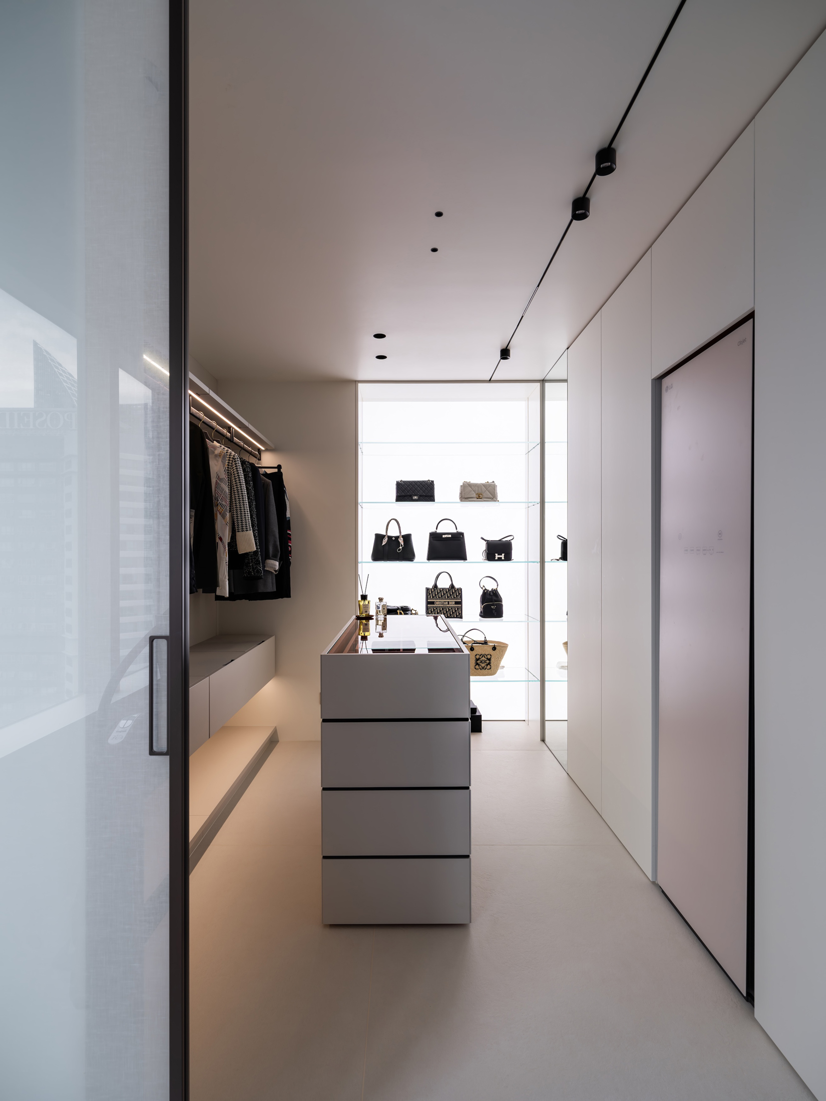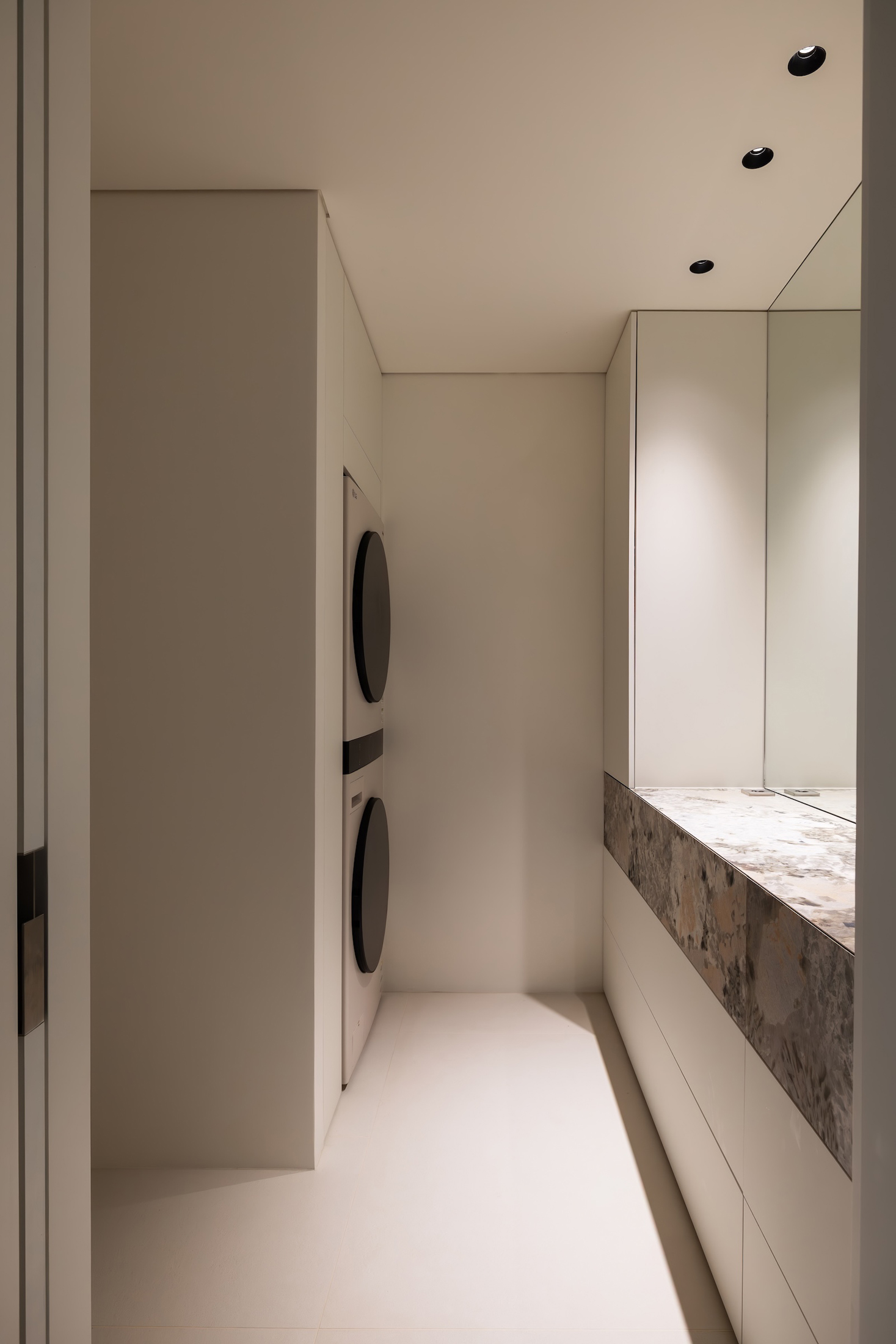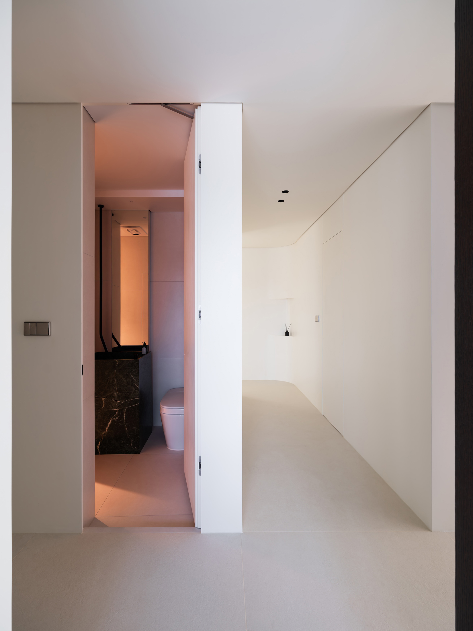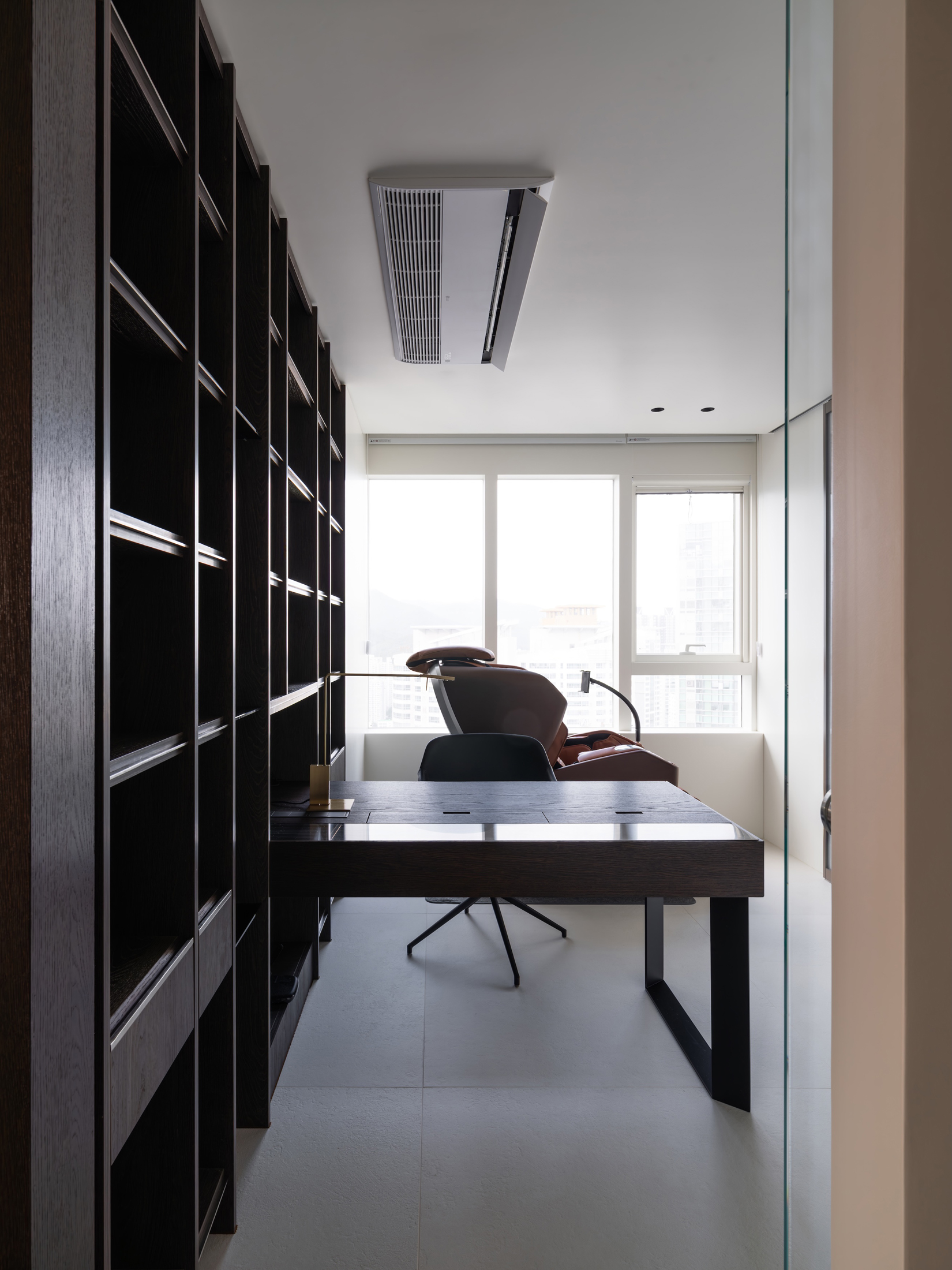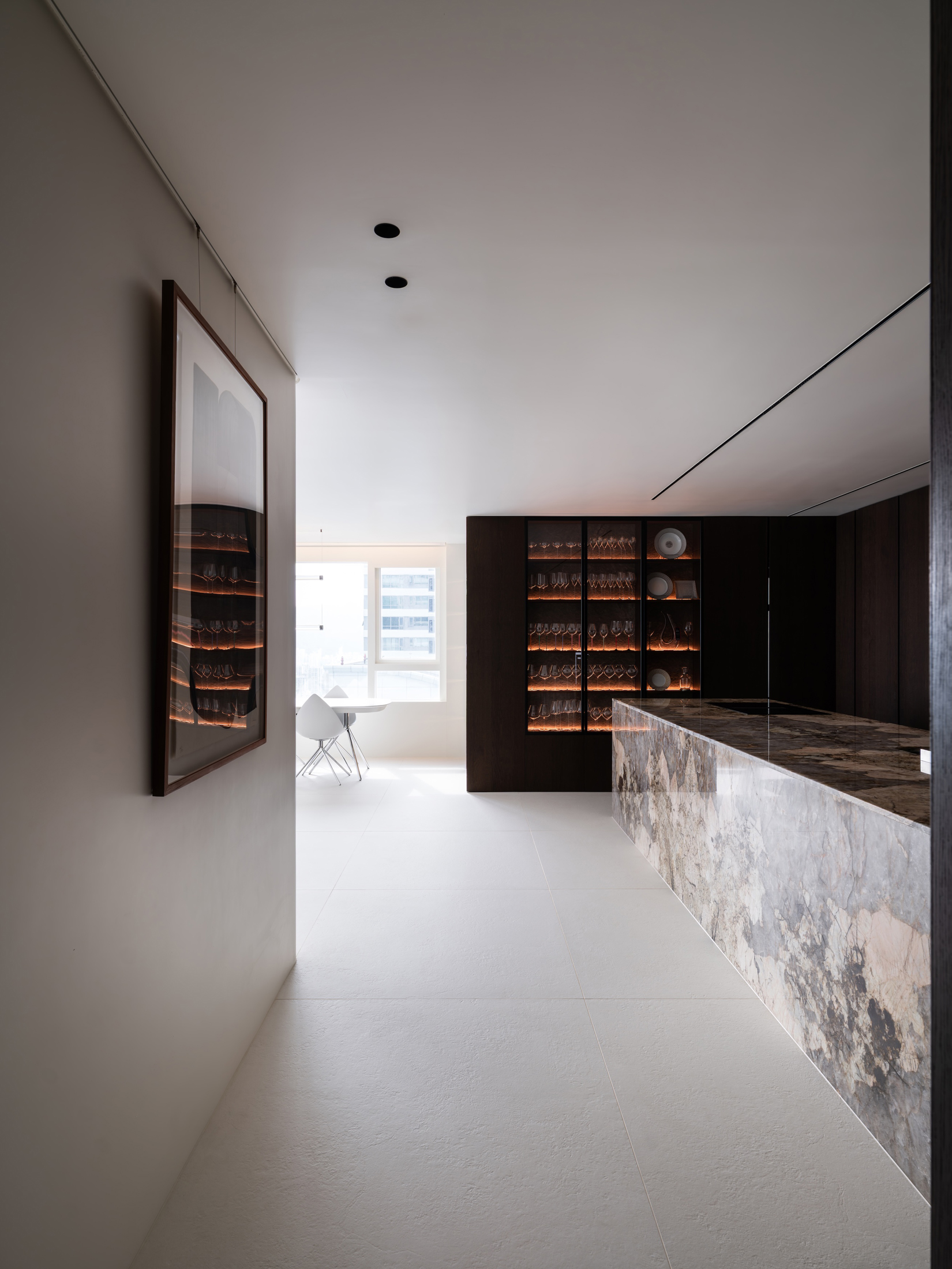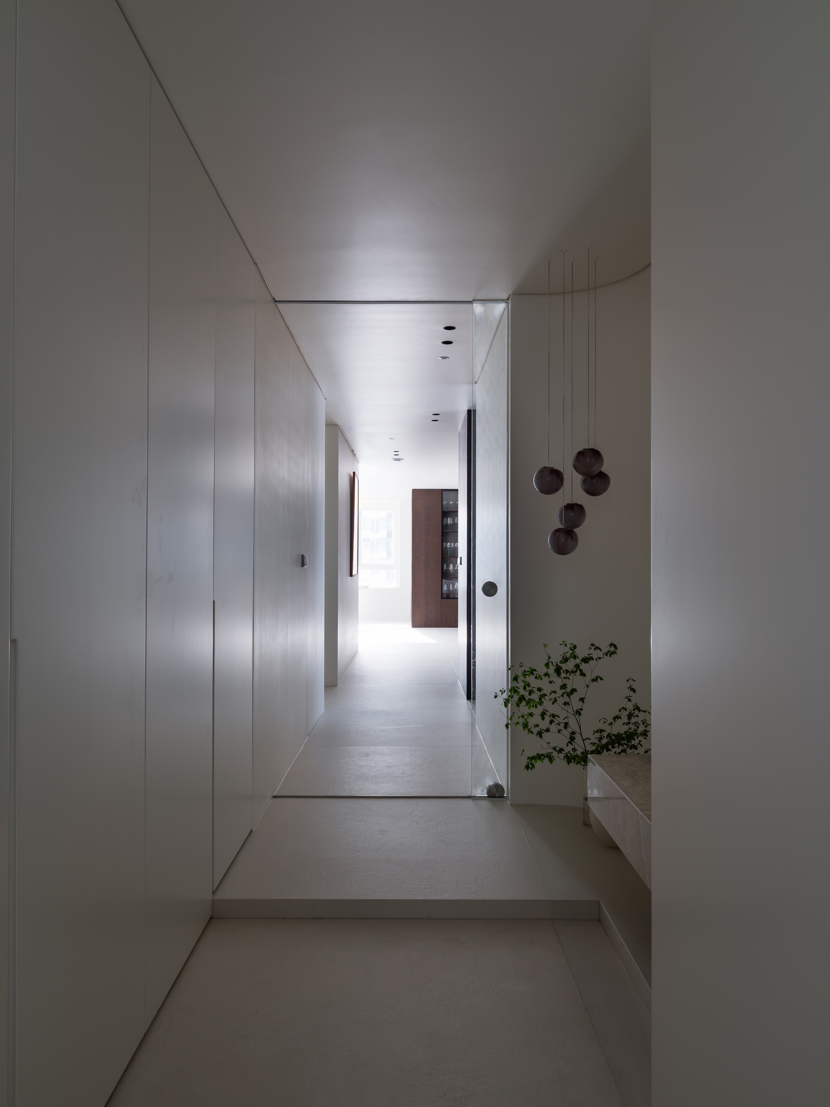 해운대 마린시티의 정점에 위치한 아델리스는 오피스텔 타입 주거 형태로 기존 평면을 개선해 필요한 공간을 극대화하는 레이아웃 작업에 매우 많은 노력을 기울인 공간이다. 불필요한 공간은 과감히 철거해서 필수적인 공간으로 편입시켜 공간을 확대했으며, 고객의 취향과 공간의 특성에 맞는 고급 마감재들로 미감이 충족되도록 설계하였다. 바다와 가장 가까운 곳에 위치한 아델리스의 아침은 윤슬에 반사된 자연광이 집안 내부를 충분히 밝히고 있다. 공간이 자연광을 충분히 머금을 수 있도록 고급도장마감으로 공간 전체를 계획했다. 사실 이번 공간의 특별함은 해가 진 이후부터 드러난다. 클라이언트와 충분히 고민해서 만들어낸 조명 위치와 개수, 그리고 조명하는 방식은 공간을 더욱 완결성 있게 만드는 핵심이었다.