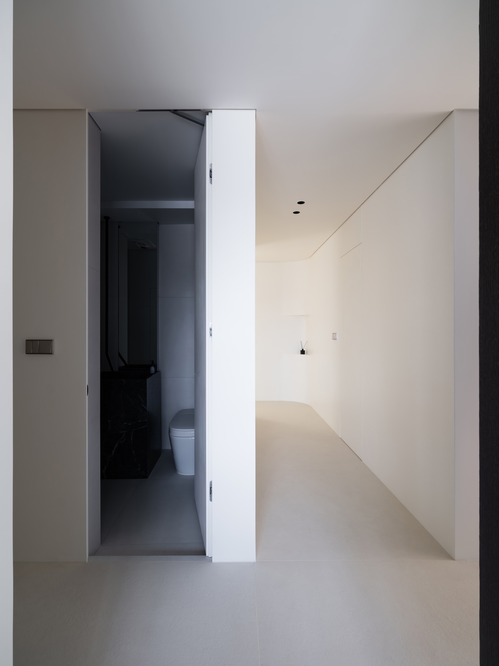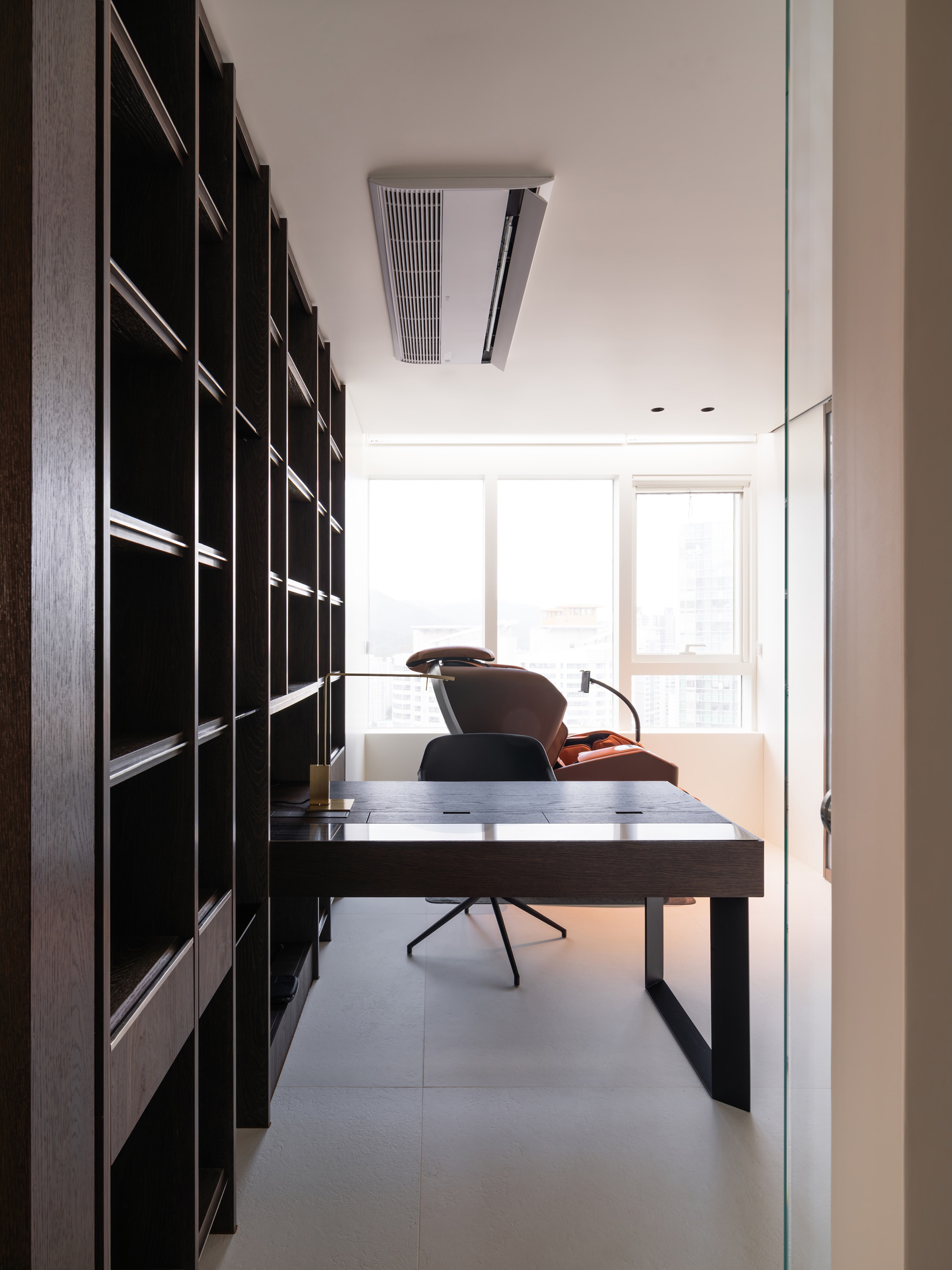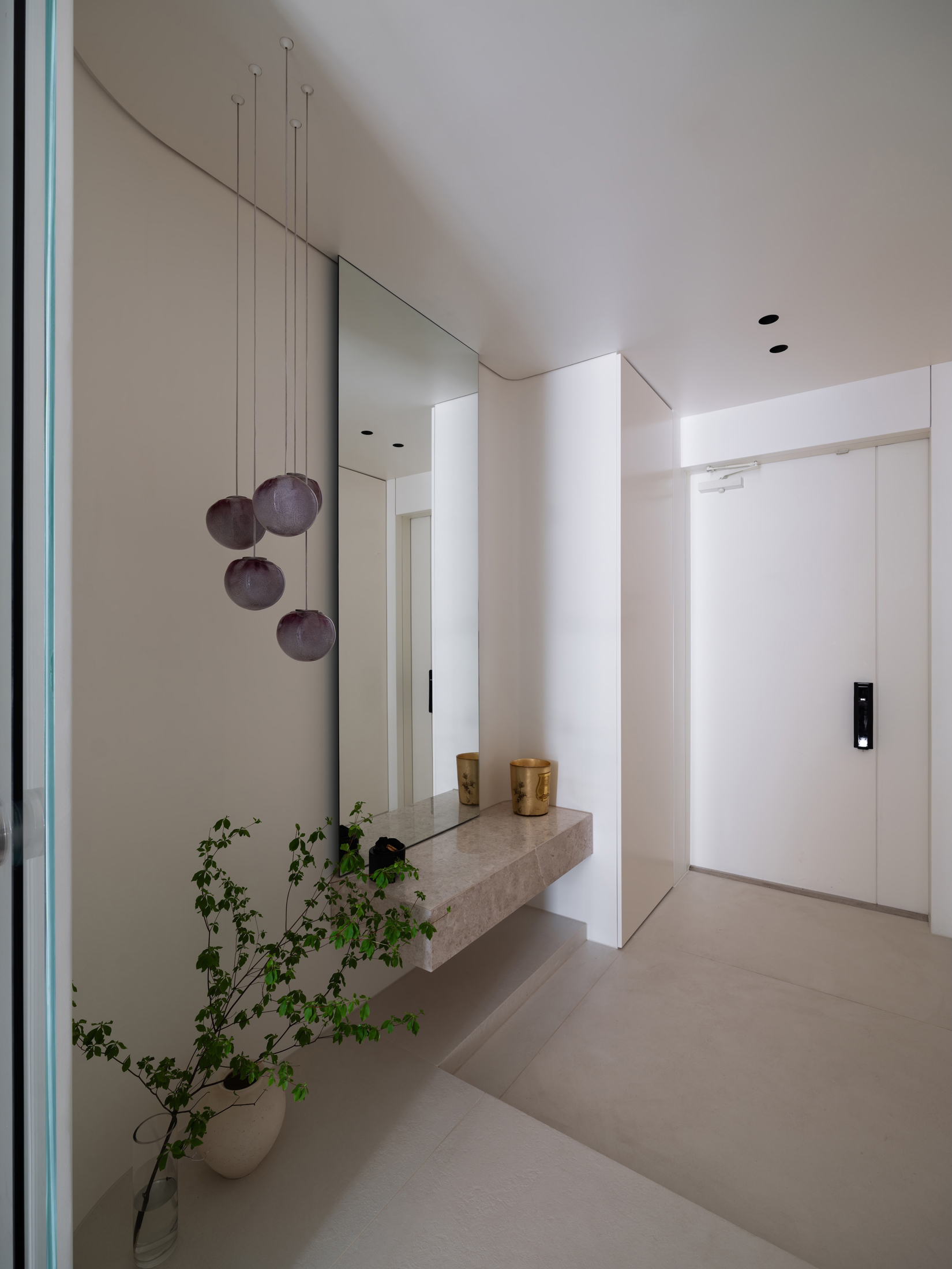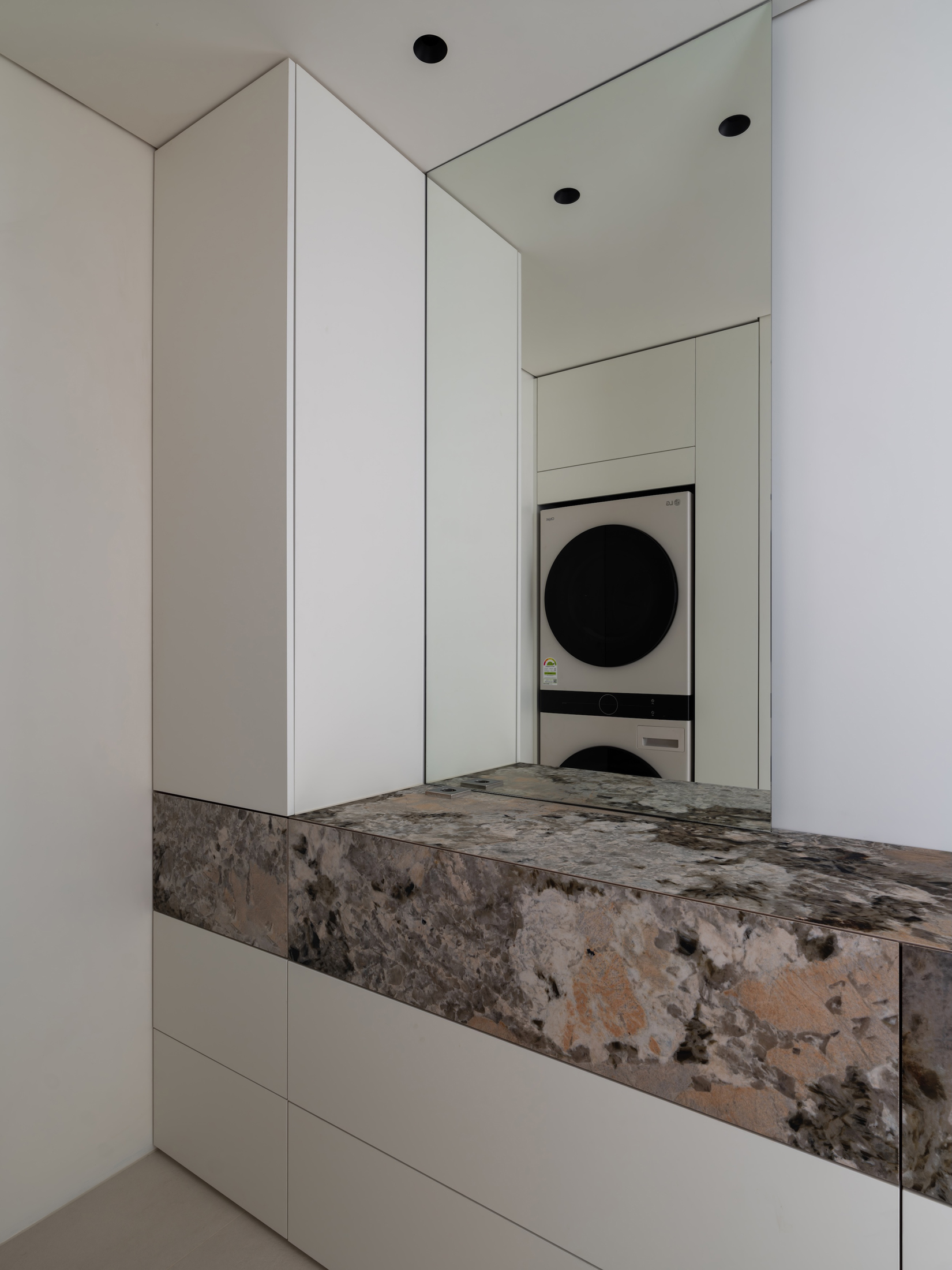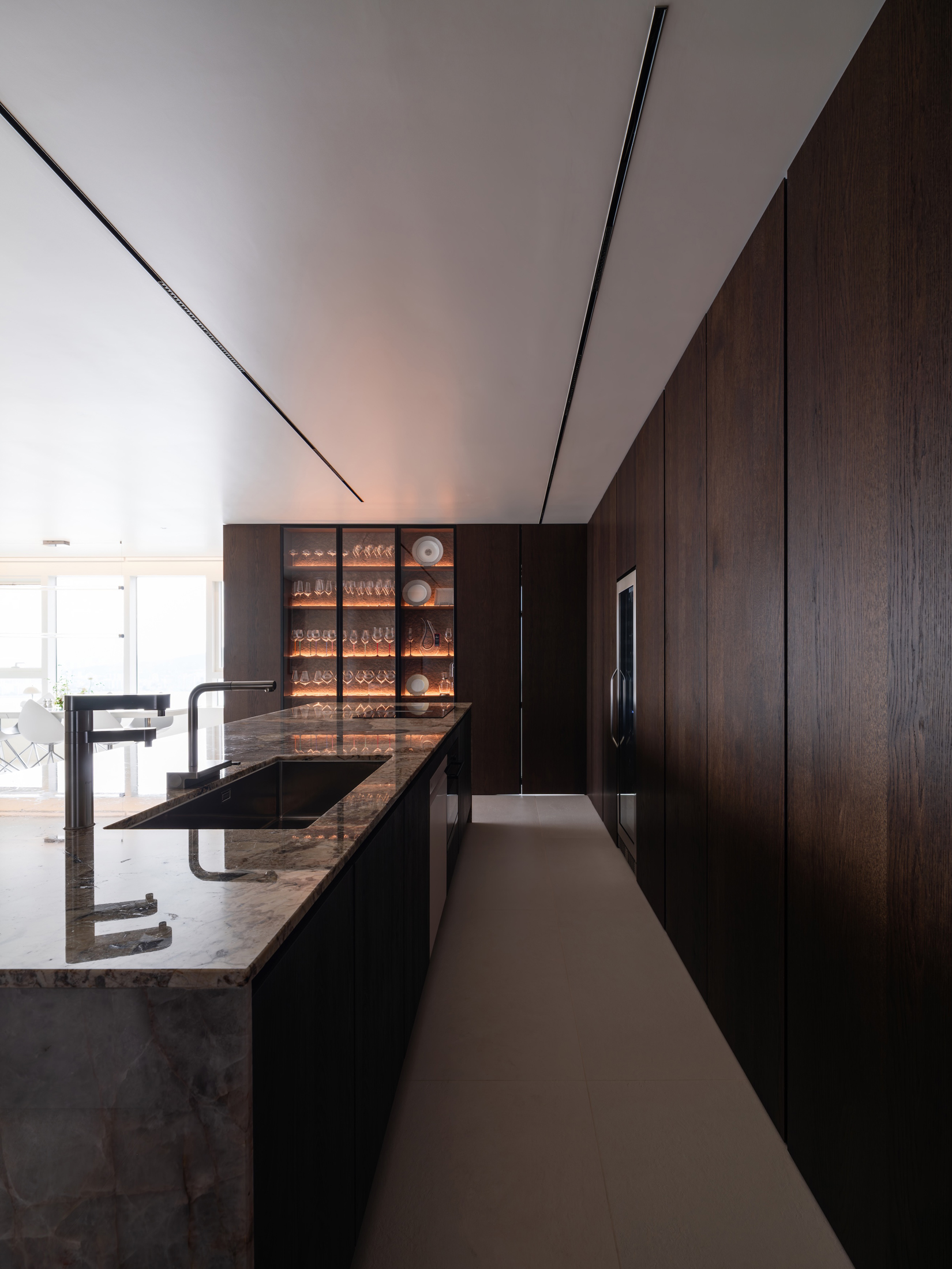 해운대 마린시티의 정점에 위치한 아델리스는 오피스텔 타입 주거 형태로 기존 평면을 개선해 필요한 공간을 극대화하는 레이아웃 작업에 매우 많은 노력을 기울인 공간이다. 불필요한 공간은 과감히 철거해서 필수적인 공간으로 편입시켜 공간을 확대했으며, 고객의 취향과 공간의 특성에 맞는 고급 마감재들로 미감이 충족되도록 설계하였다. 바다와 가장 가까운 곳에 위치한 아델리스의 아침은 윤슬에 반사된 자연광이 집안 내부를 충분히 밝히고 있다. 공간이 자연광을 충분히 머금을 수 있도록 고급도장마감으로 공간 전체를 계획했다. 사실 이번 공간의 특별함은 해가 진 이후부터 드러난다. 클라이언트와 충분히 고민해서 만들어낸 조명 위치와 개수, 그리고 조명하는 방식은 공간을 더욱 완결성 있게 만드는 핵심이었다.