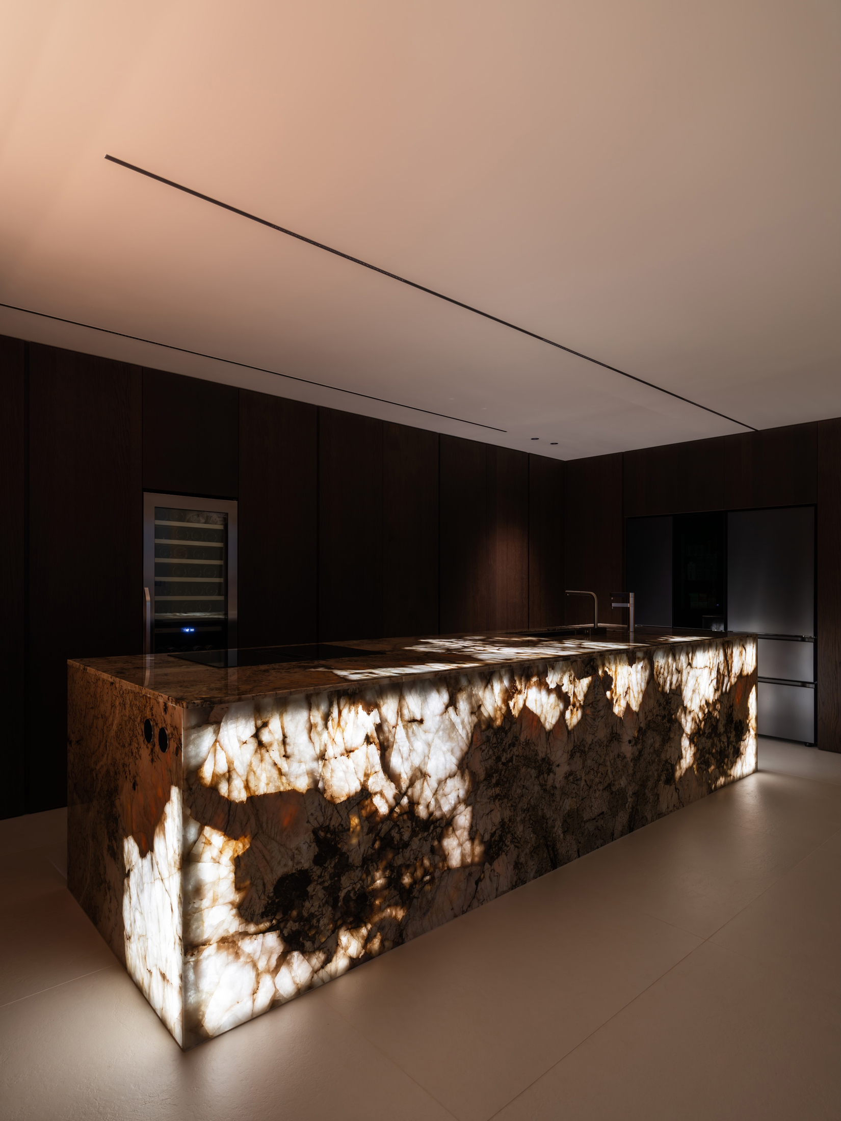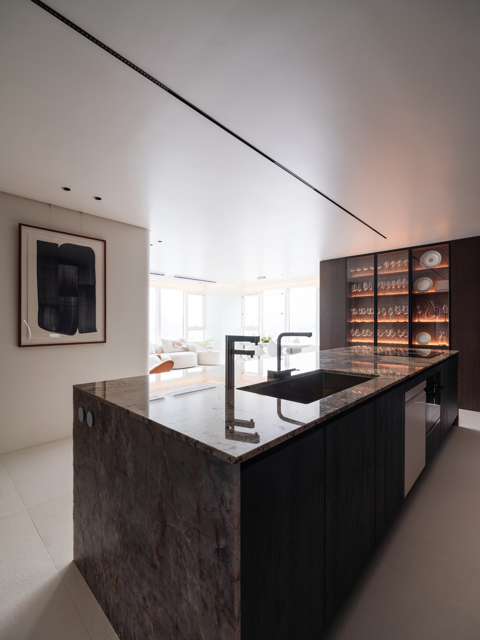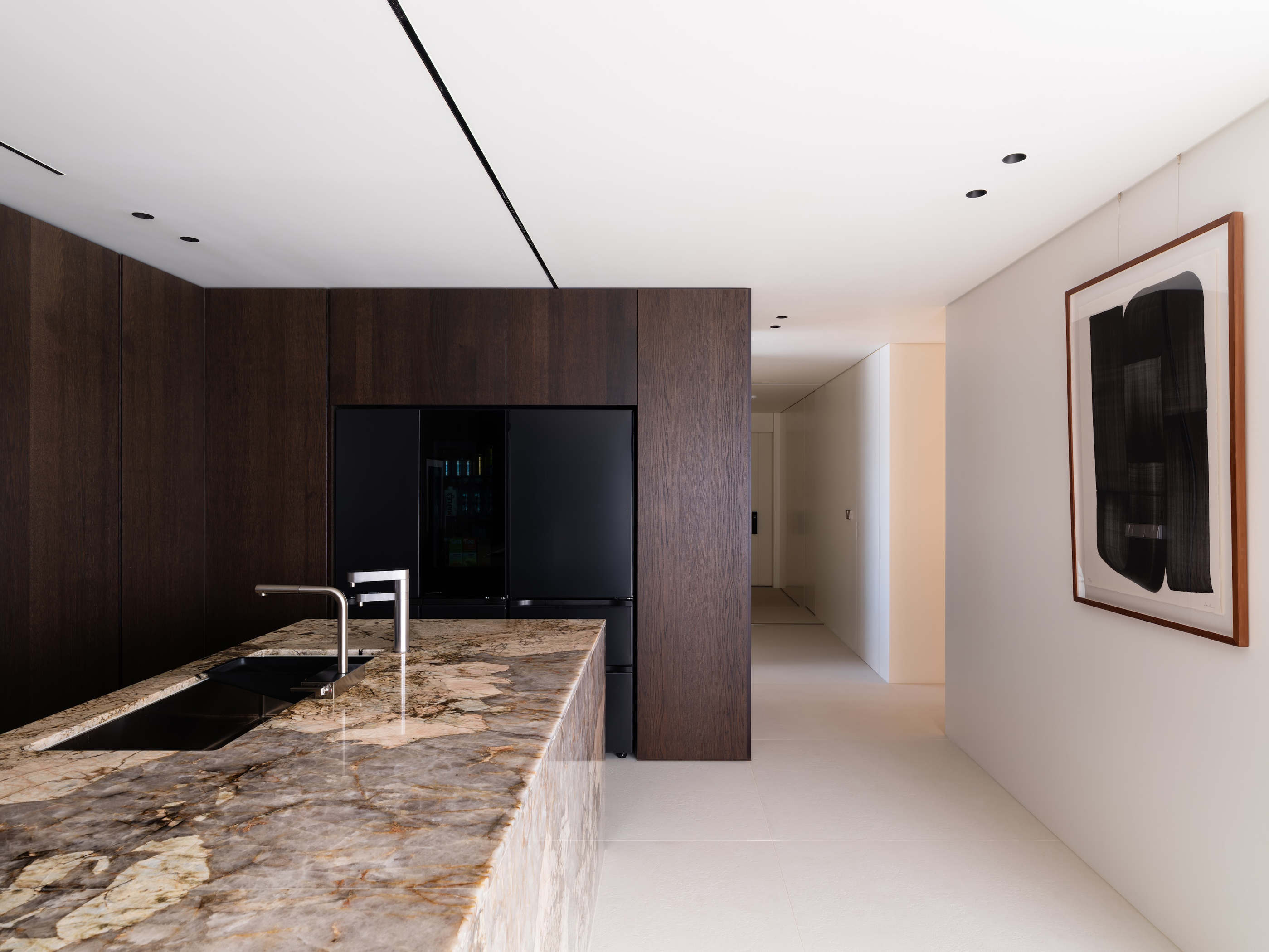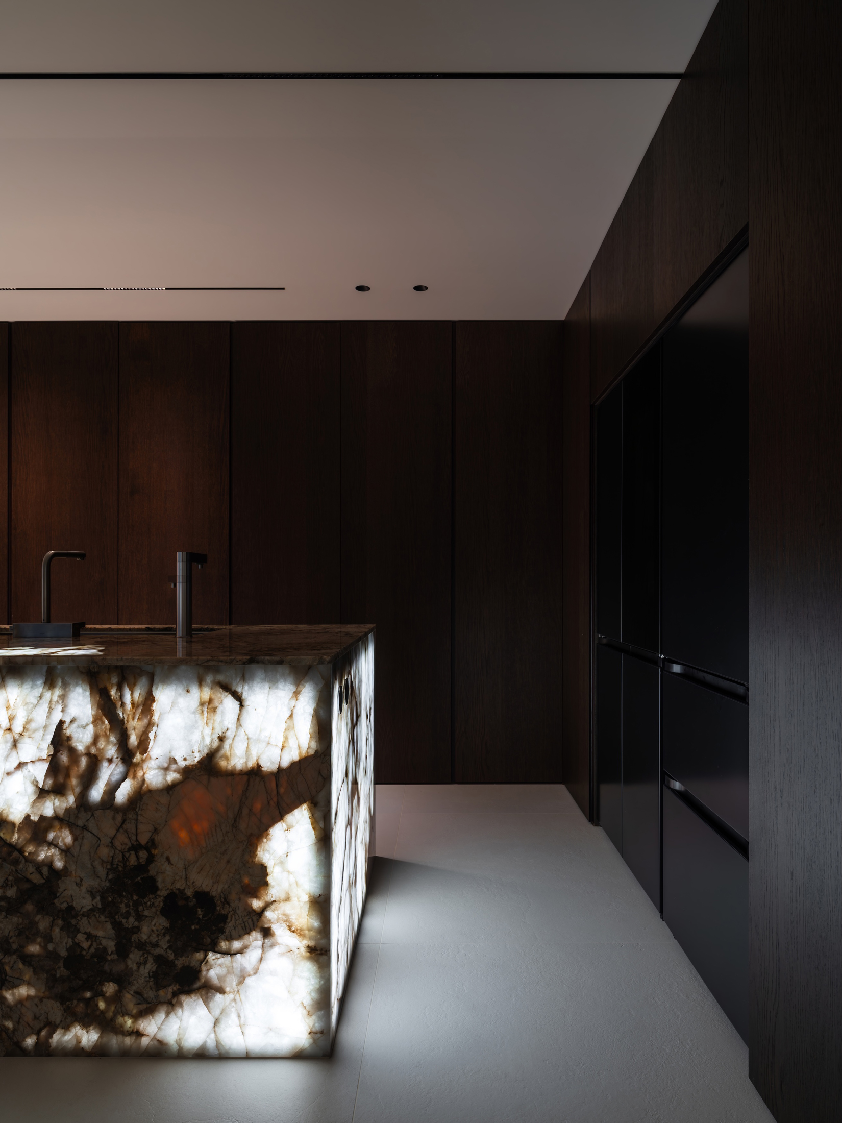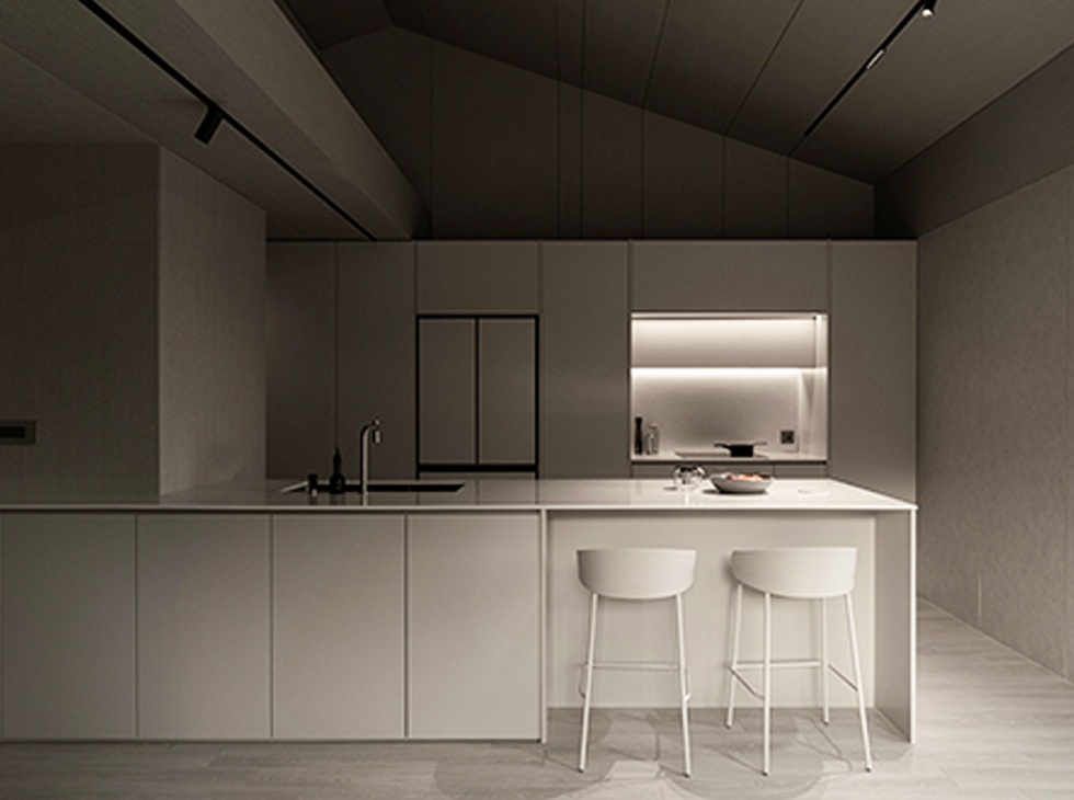 해운대 마린시티의 정점에 위치한 아델리스는 오피스텔 타입 주거 형태로 기존 평면을 개선해 필요한 공간을 극대화하는 레이아웃 작업에 매우 많은 노력을 기울인 공간이다. 불필요한 공간은 과감히 철거해서 필수적인 공간으로 편입시켜 공간을 확대했으며, 고객의 취향과 공간의 특성에 맞는 고급 마감재들로 미감이 충족되도록 설계하였다. 바다와 가장 가까운 곳에 위치한 아델리스의 아침은 윤슬에 반사된 자연광이 집안 내부를 충분히 밝히고 있다. 공간이 자연광을 충분히 머금을 수 있도록 고급도장마감으로 공간 전체를 계획했다. 사실 이번 공간의 특별함은 해가 진 이후부터 드러난다. 클라이언트와 충분히 고민해서 만들어낸 조명 위치와 개수, 그리고 조명하는 방식은 공간을 더욱 완결성 있게 만드는 핵심이었다.