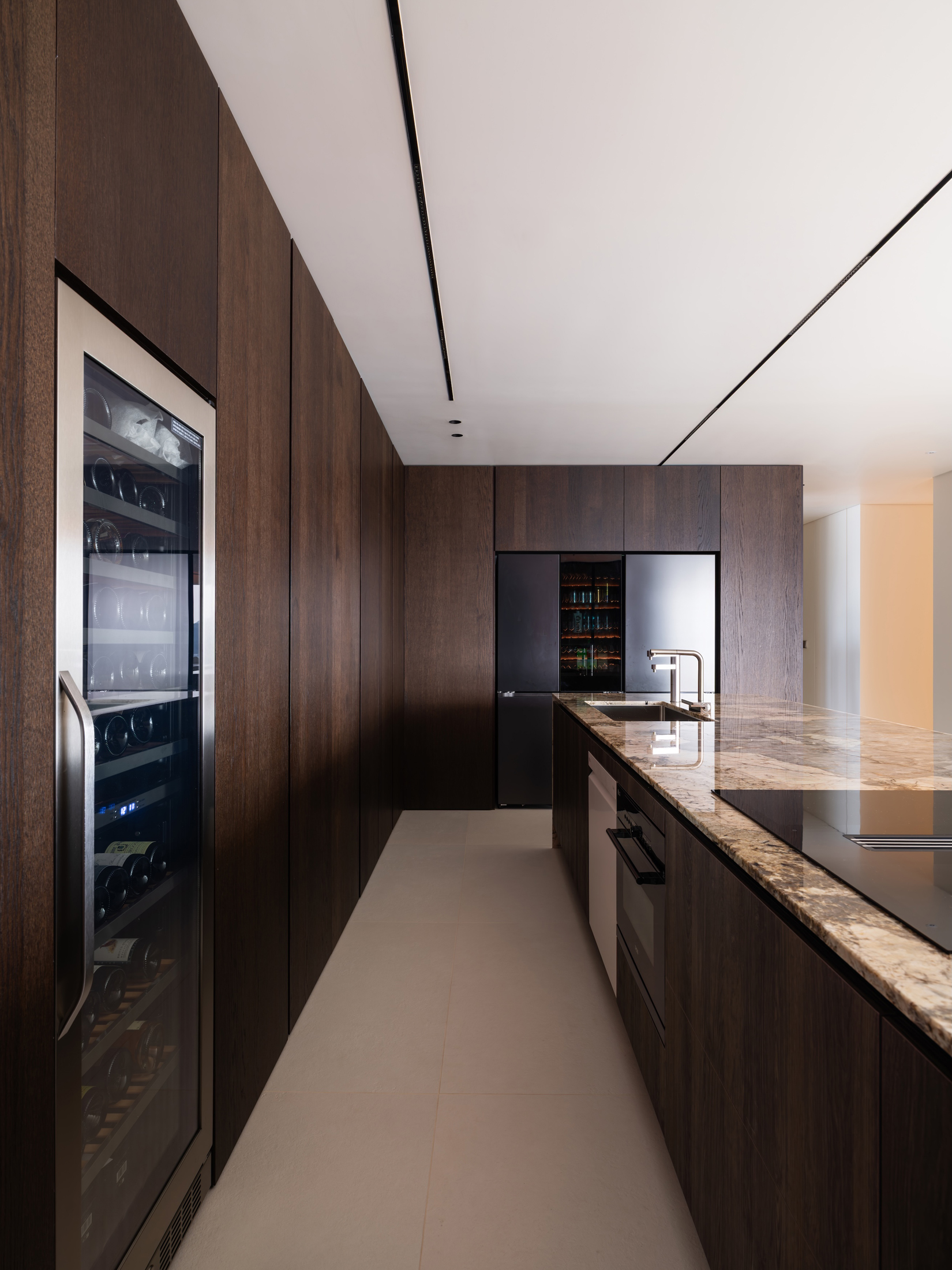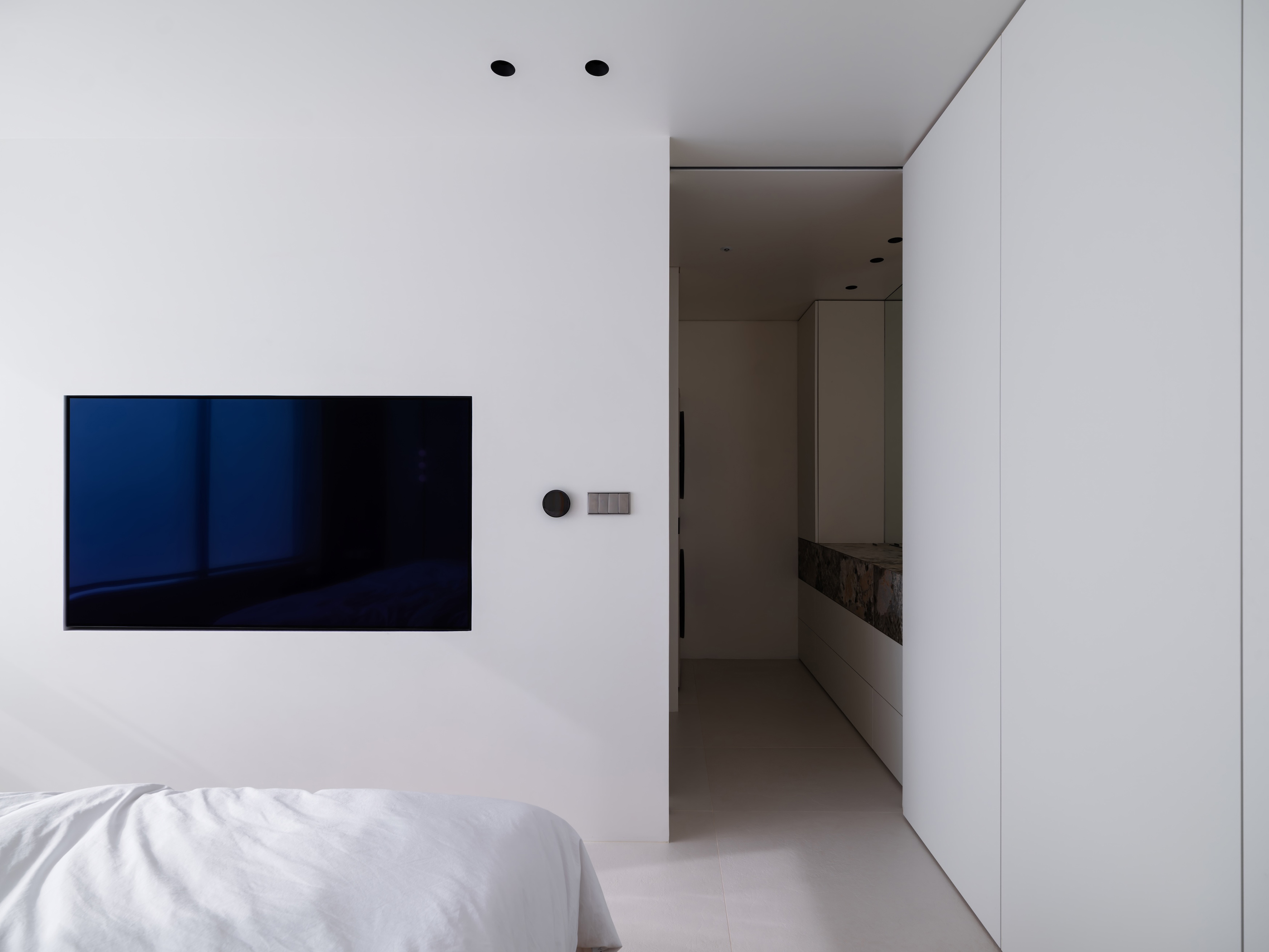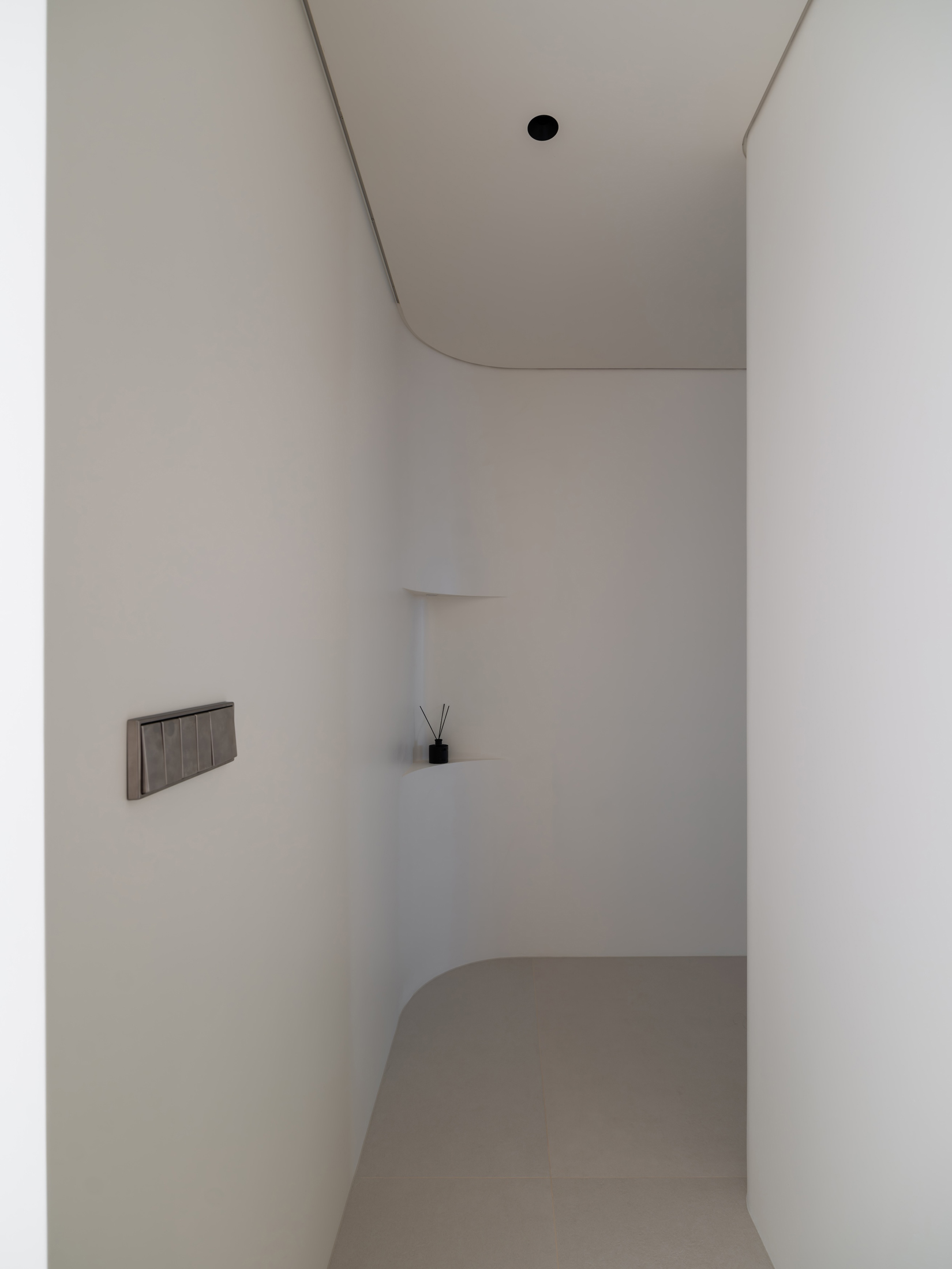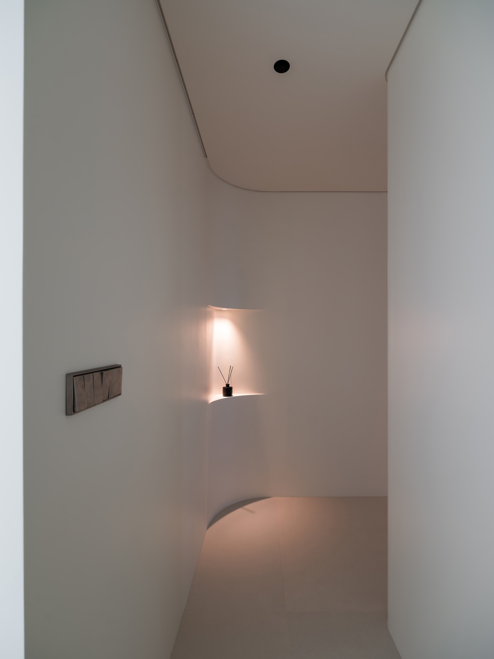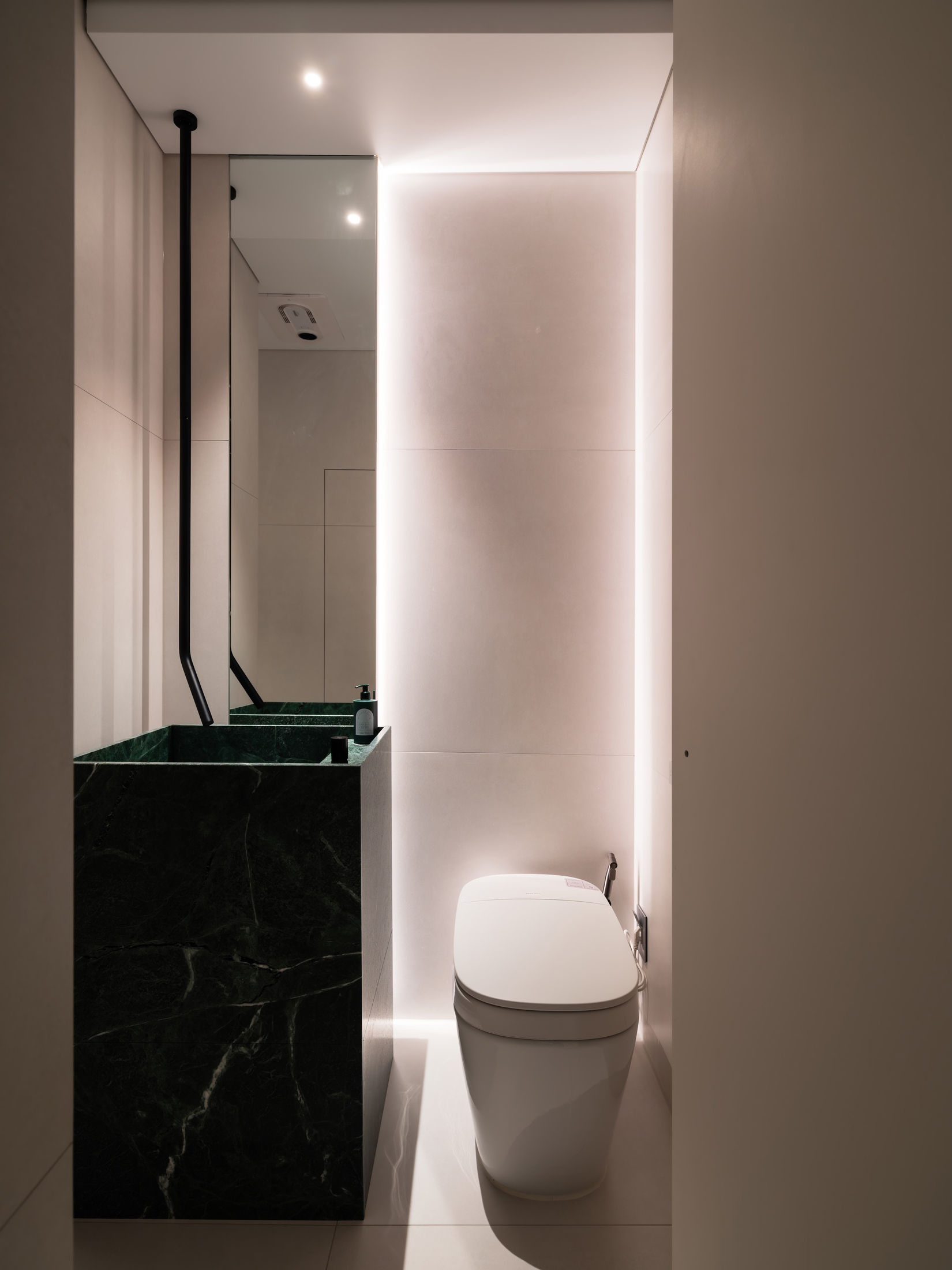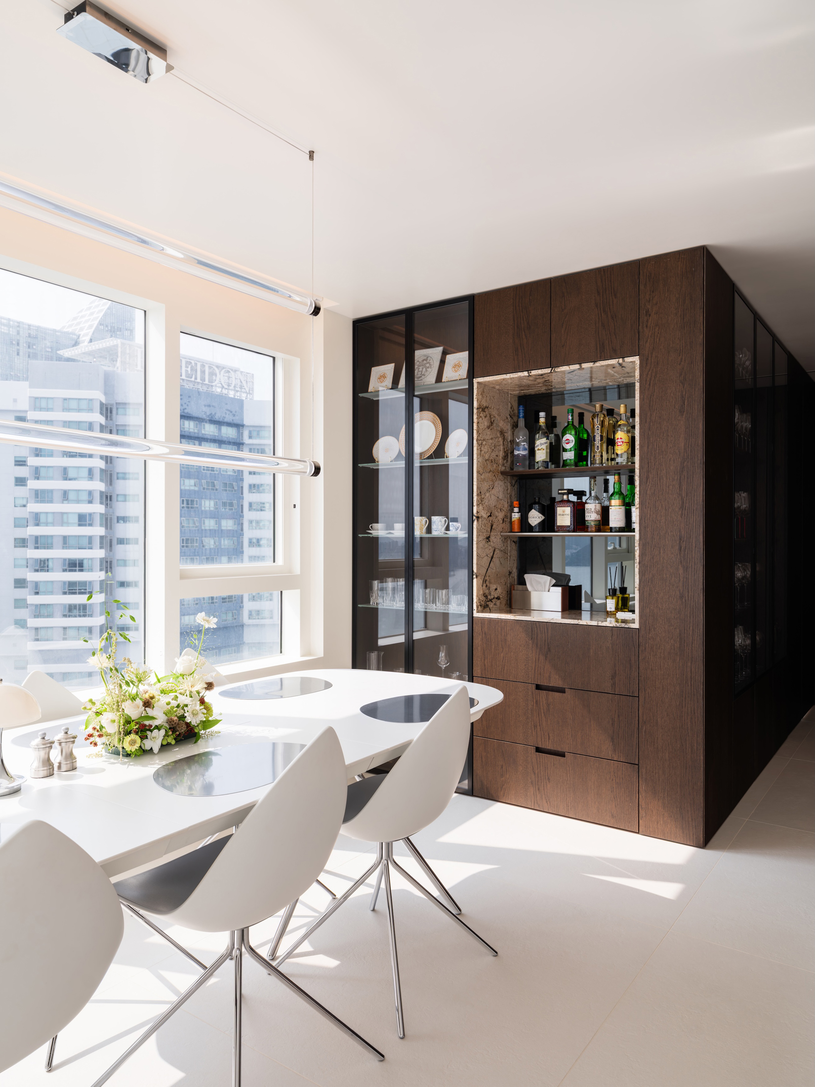 해운대 마린시티의 정점에 위치한 아델리스는 오피스텔 타입 주거 형태로 기존 평면을 개선해 필요한 공간을 극대화하는 레이아웃 작업에 매우 많은 노력을 기울인 공간이다. 불필요한 공간은 과감히 철거해서 필수적인 공간으로 편입시켜 공간을 확대했으며, 고객의 취향과 공간의 특성에 맞는 고급 마감재들로 미감이 충족되도록 설계하였다. 바다와 가장 가까운 곳에 위치한 아델리스의 아침은 윤슬에 반사된 자연광이 집안 내부를 충분히 밝히고 있다. 공간이 자연광을 충분히 머금을 수 있도록 고급도장마감으로 공간 전체를 계획했다. 사실 이번 공간의 특별함은 해가 진 이후부터 드러난다. 클라이언트와 충분히 고민해서 만들어낸 조명 위치와 개수, 그리고 조명하는 방식은 공간을 더욱 완결성 있게 만드는 핵심이었다.